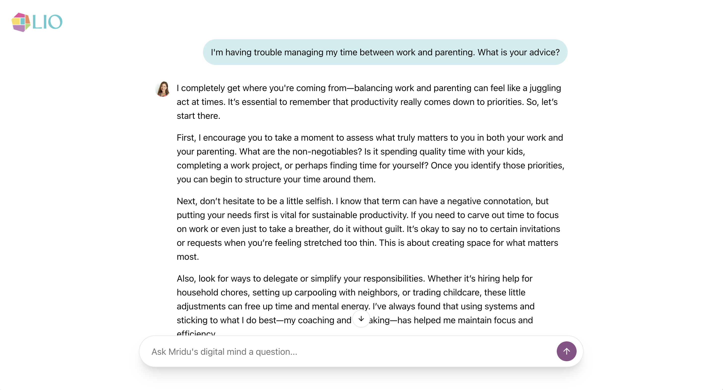 Life is Organized is a productivity consulting business founded by Mridu Parikh. As her practice continues to grow, she envisioned a chatbot that could provide her advice at scale, offering immediate support while maintaining her distinctive approach and voice. I built this chatbot for a fraction of the cost of existing solutions that provide the same services.